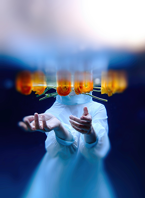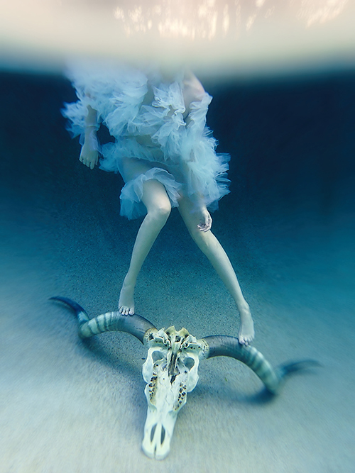 This series lives in the hypnopompic space — the threshold where sleep loosens its grip but waking has not yet taken hold. Created underwater in my backyard pool, the images gather that in-between stillness, shaped by shifting light, drifting fabric, and the quiet unpredictability of water. The work feels like drifting through two worlds at once, suspended in the breath between them.