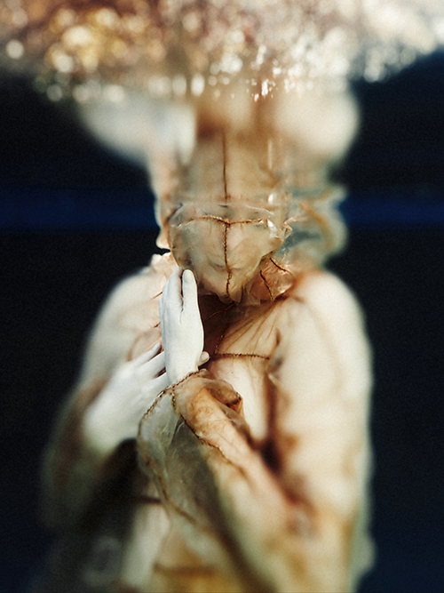 The studio itself is part cabinet of curiosities, part workshop — but mostly it’s a nest of treasures. Every corner holds something unexpected, gathered the way a crow collects glimmers or a fox tucks away its finds. Skulls and horns from animals we cared for in life, now kept close after they’ve passed, rest alongside snakeskins coiled in jars, insects pinned in quiet rows, and drawers of vintage paper and gold leaf. There are oddities with stories — pieces of my father’s taxidermy collection that I now treasure — not for their rarity, but for the connection they keep alive. I feel it every time I work with them. Most recently, I used his gut skin parka, made by an Indigenous maker in Alaska, in an underwater shoot — the material moving with a dreamlike fluidity, carrying both history and breath into the image.