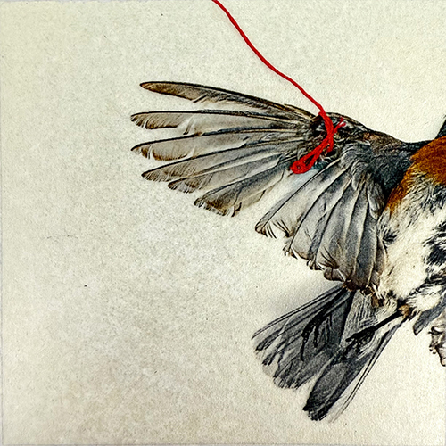 A single red thread runs through each image, symbolizing the pulse of life — a lifeline that both connects and contrasts the fragility of existence. Made from gathered leaves, branches, or petals, each piece is printed on acid-free vellum and touched with 12k gold leaf, transforming humble fragments into sacred artifacts. The work feels like a quiet pause in time, where fragility and resilience are held together in the same breath.